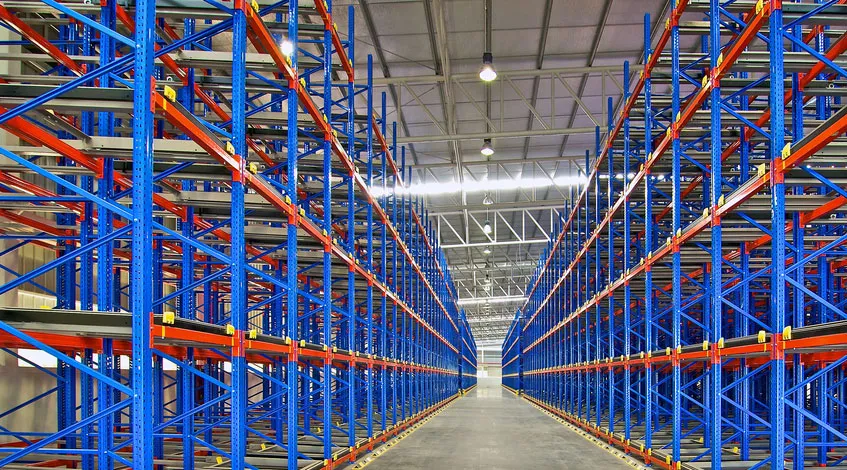 Drive-through racking system is a high density FIFO storage system. It enables the forklifts to access racks to load and offload pallets. This system uses rails instead of rollers to support pallet storage operations. It can be used to store high contents of a similar product.